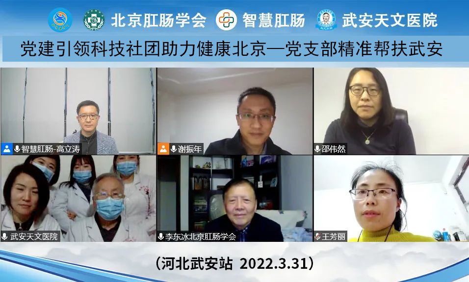 2022年3月31日,北京肛肠学会党支部开展“党建引领科技社团创新发展”精准帮扶活动。此次帮扶的对象是河北武安天文肛肠医院。