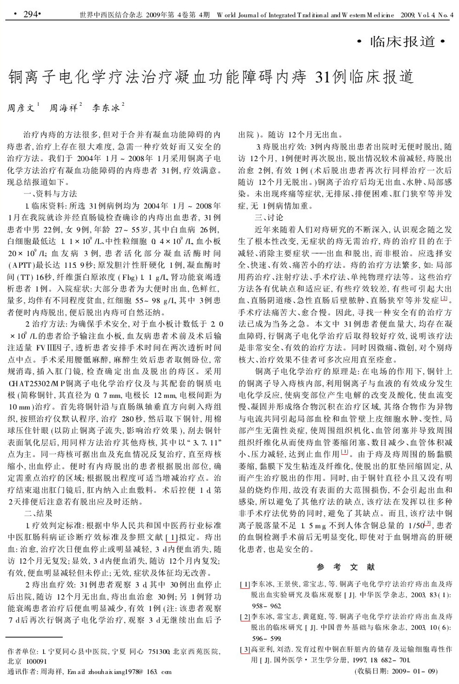 北京肛肠学会—铜离子电化学疗法治疗凝血功能障碍内痔31例临床报道
