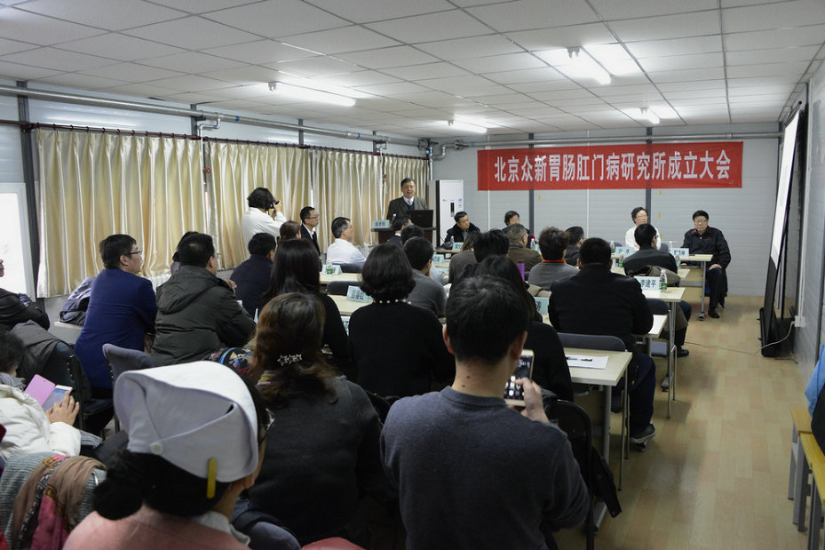 2016年2月3日下午,北京胃肠肛门病研究所成立大会暨揭牌仪式在北京丰台区右安门医院会议室举行。北京肛肠学会会长、中国中医科学院西苑医院李东冰教授、北京肛肠学会副会长、北京中医药大学东方医院刘仍海教授、北京肛肠学会副会长、北京大学附属第三医院陈朝文教授、北京肛肠学会副会长、北京市肛肠医院陈希琳教授、北京丰台区右安门医院医务科刘序科长、首都医科大学附属同仁医院谭嗣伟教授、北京理工大学材料学院钟海政教授、首都医科大学附属北京康复医院贾军峰教授、北京理化测试中心魏玲等二十余位大学及三级医院著名学者和专家及十余位企业代表共同参加了北京胃肠肛门病研究所成立大会暨揭牌仪式。