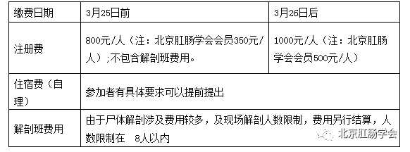 第一:3月25日前缴费人员培训班注册费800元/人(含资料费、学分、餐、结业证书费等);免年会注册费。北京肛肠学会会员享受优惠即350元(含资料费、学分、餐、结业证书及其它等),免年会注册费。需要将住宿费一并包含在会务费中的会员和非会员可单独申请(具体费用详细咨询会务组)