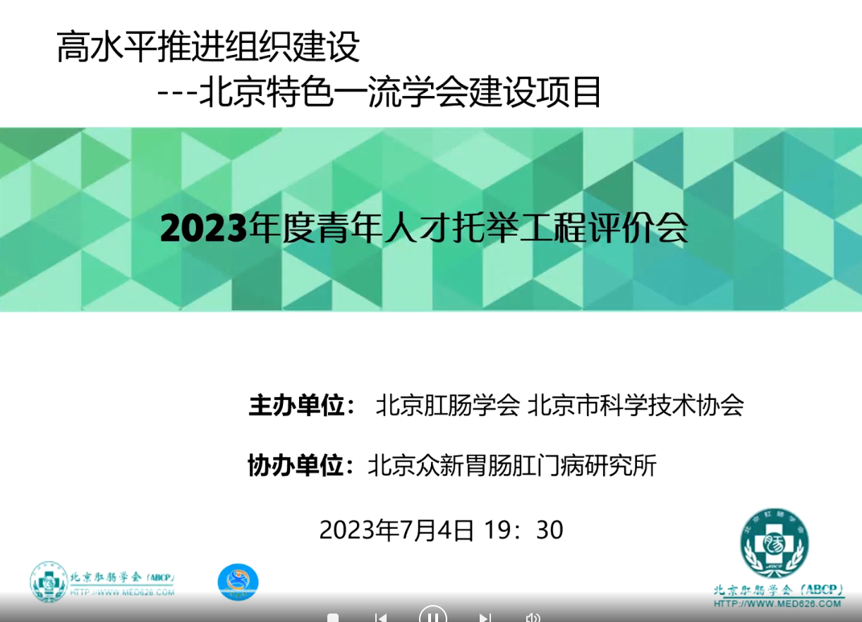 2023年7月4日,由北京肛肠学会主办,北京众新胃肠肛门病研究所协办、北京市科学技术协会指导的“高水平推进组织建设--青年人才托举工程”会议在云端成功举办。本次会议汇集医学领域的专家学者,共同探讨学会建设与学术研究的最新动态。