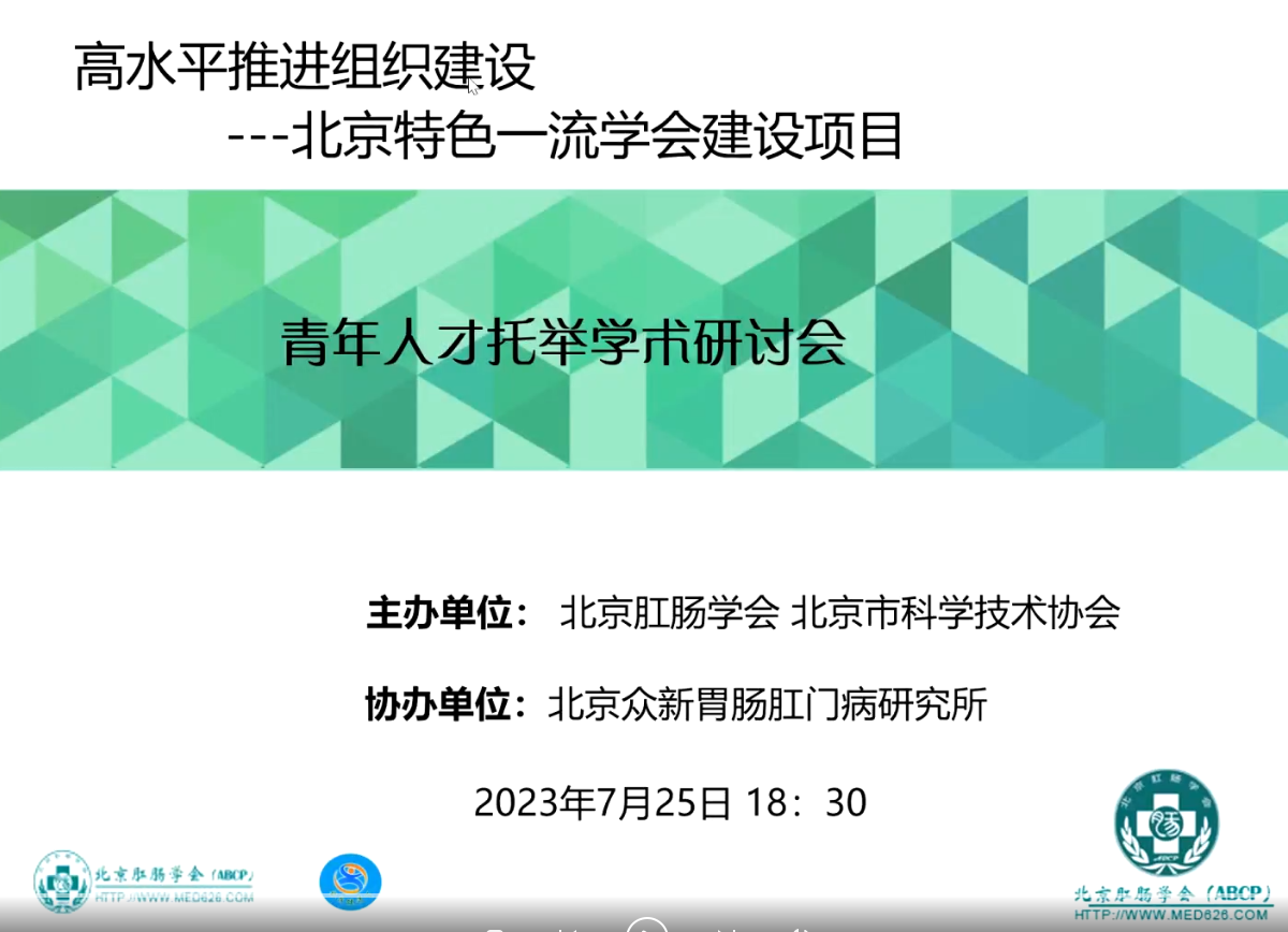 7月25日,北京肛肠学会青年人才托举学术研讨会,在云端召开。本次研讨会由北京肛肠学会主办,北京市科学技术协会指导,北京众新胃肠肛门病研究所协办。